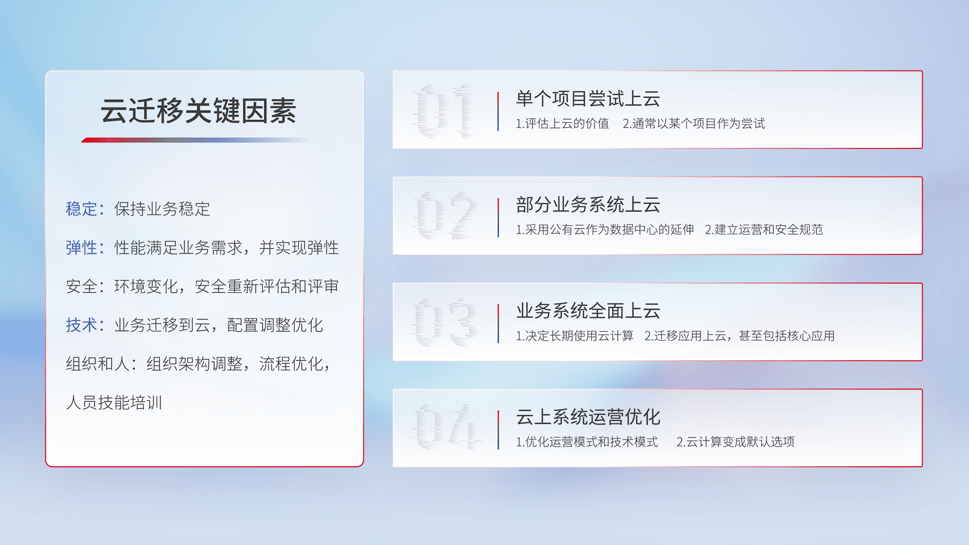 结合实际业务,,,,从规划设计、、云平台选型、、、云原生改造、、、数据迁移、、、集成交付,,,迁移全过程为客户识别最佳上云路径,,做好风险识别管理,,,设计网络架构、、身份权限、、、、安全审计合规、、、、操作审计、、、日志审计、、监控告警策略、、多站点容灾设计等,,,,对云上基础设施进行整体规划,,,,提升IT治理水平,,,,以满足弹性、、、高可用、、、、高性能的需求。。。。