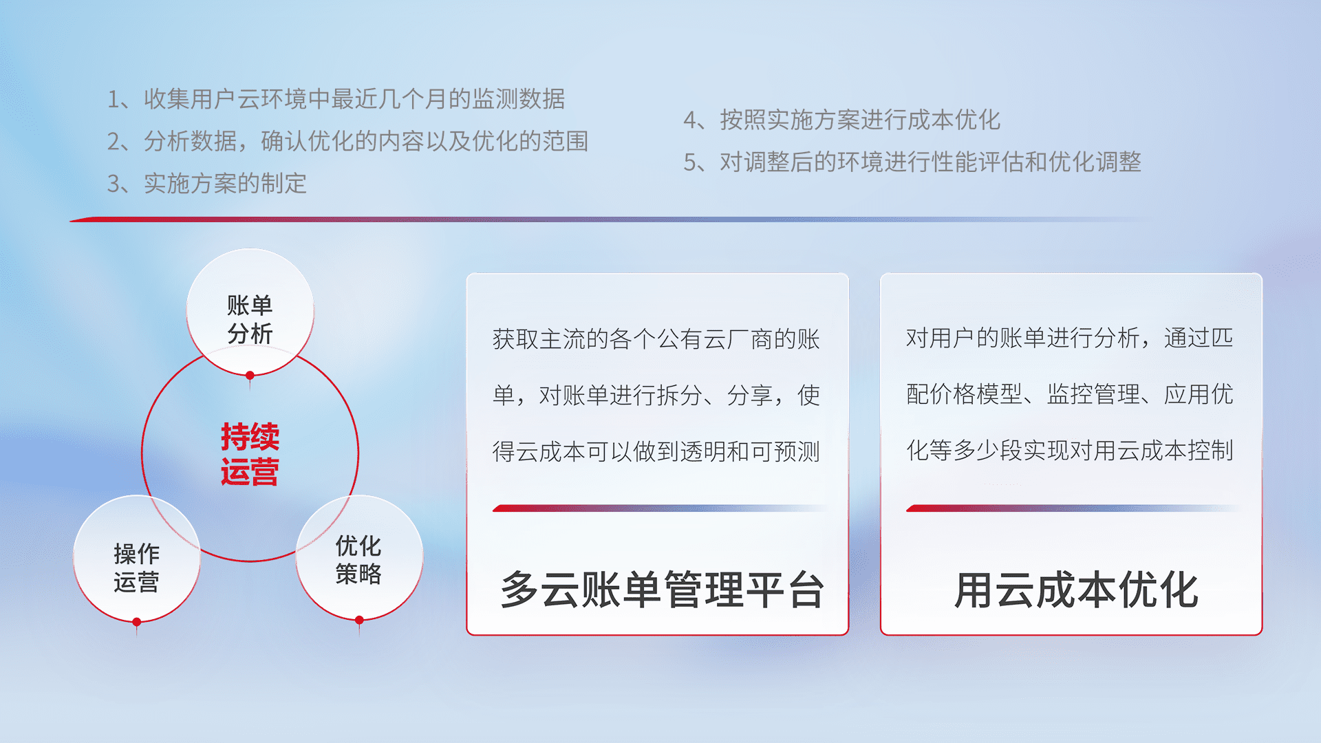 通过多云纳管,,,,以统一的资源数据模型把客户的云资源进行抽象和封装,,进而实现对多云资源的统一操作,,,保障云资源管理的可靠性、、、稳定性与可用性。。。。量身定制化运维内容,,,配置、、开发运维、、、、补丁管理、、、备份、、监控、、认证和访问管理、、审计和日常巡检等,,,,保障在用云过程中的可靠度,,,,稳定度以及高可用率。。。。